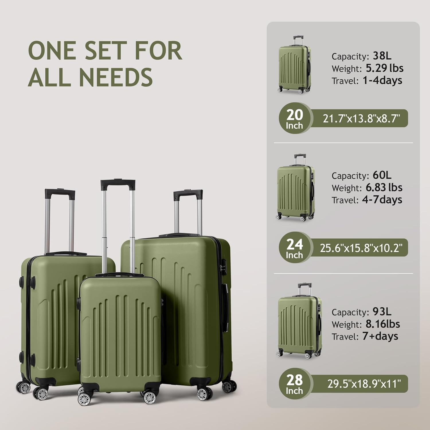 【Demision】Here are the dimensions for each size of the luggage set: – 20 inch: 21.7″ x 13.8″ x 8.7″, 38L, 5.29lbs, for 1-4 days travel – 24 inch: 25.6″ x 15.8″ x 10.2″, 60L, 6.83lbs, for 4-7 days travel – 28 inch: 29.5″ x 18.9″ x 11″, 93L, 8.16lbs, for 7+ days travel