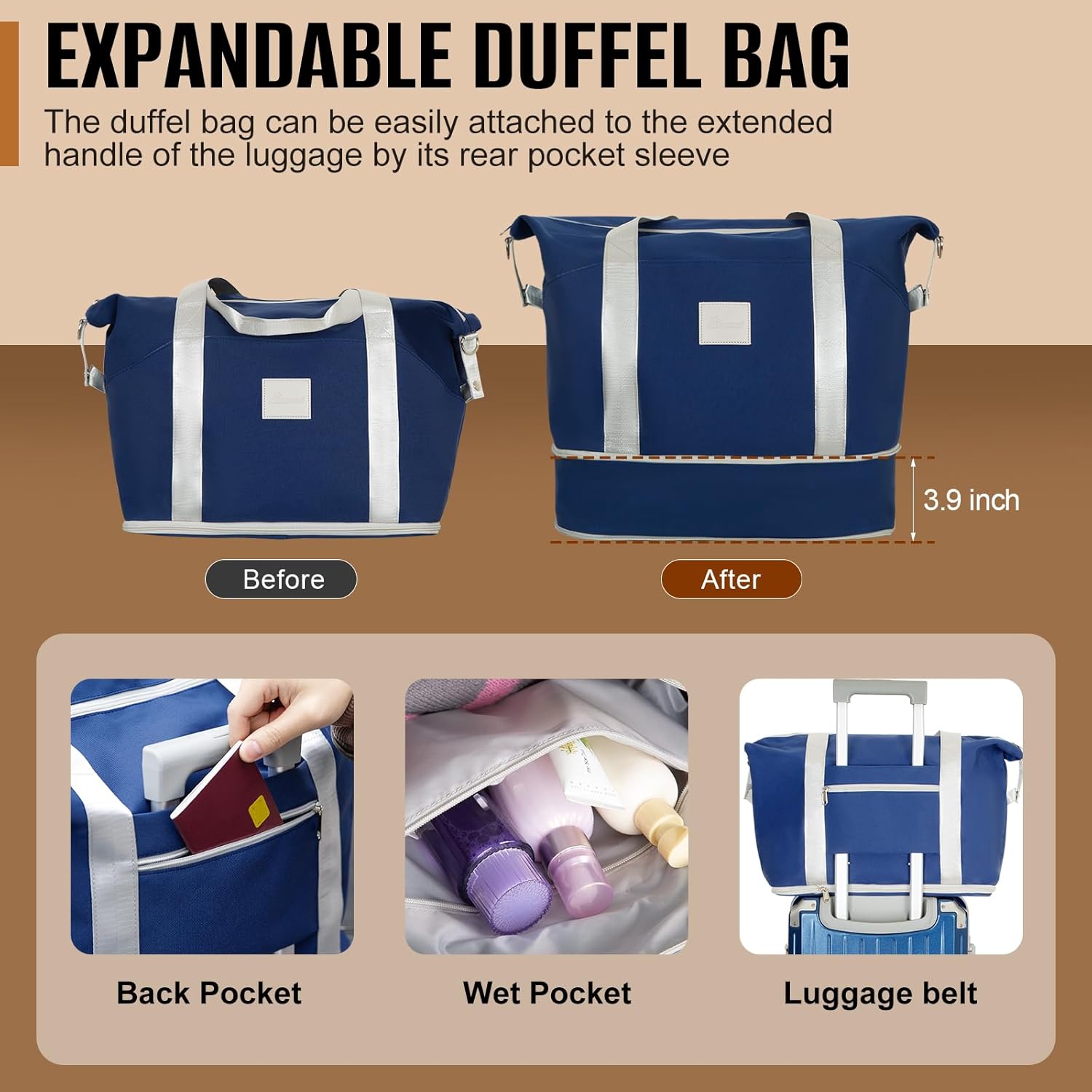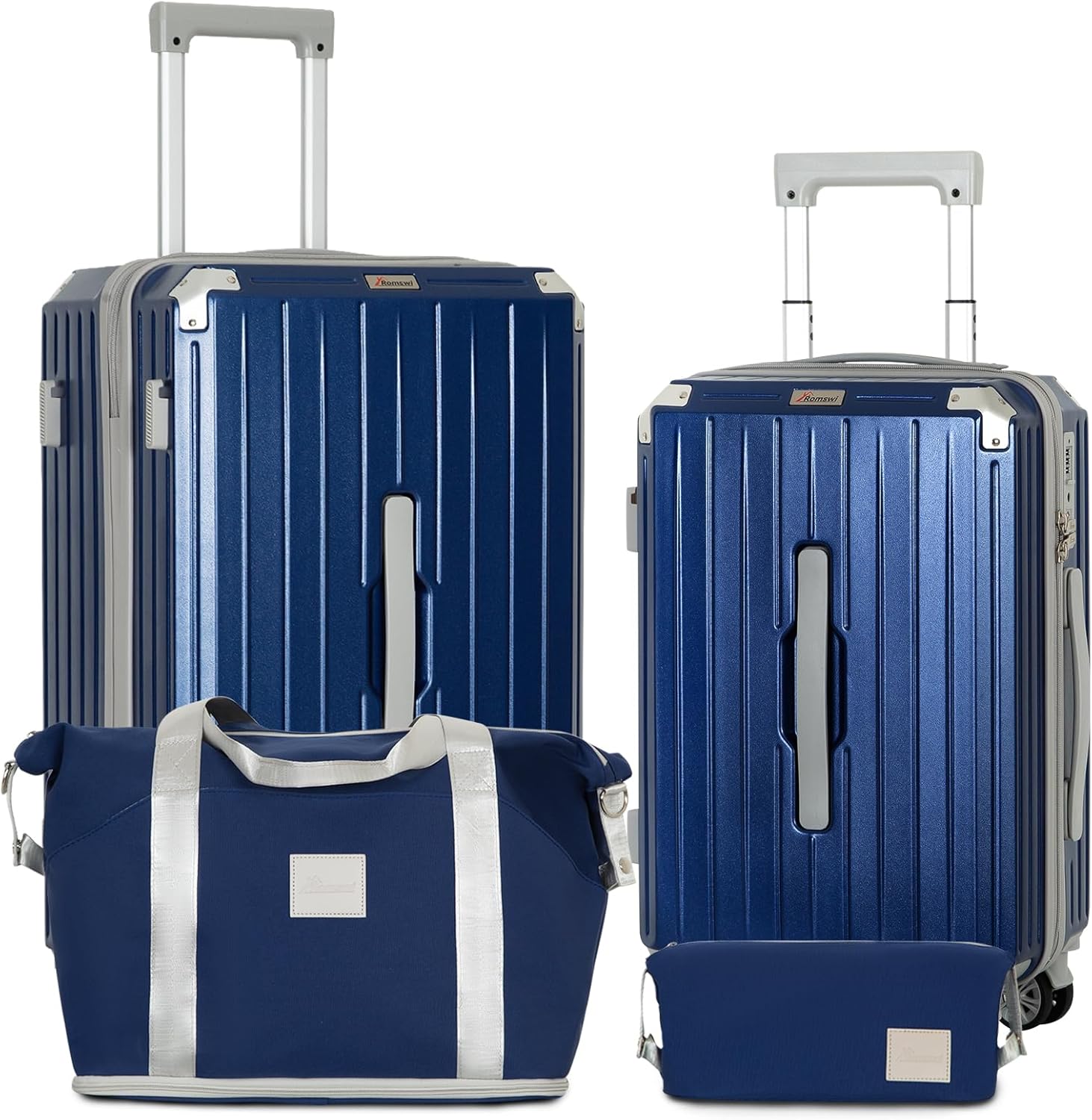 【4 Piece Luggage set】Four piece set offers a 20″ luggage, a 28″ luggage, a weekender travel duffel bag and a toiletry bag. 20in is best for carryon, 28in for check in. The duffel bag and toiletry bag are all made of polyester fabric which is mild water-resistant. The expandable design duffel bag is designed with the back sleeve, so you can conveniently attach them to the retractable luggage handle